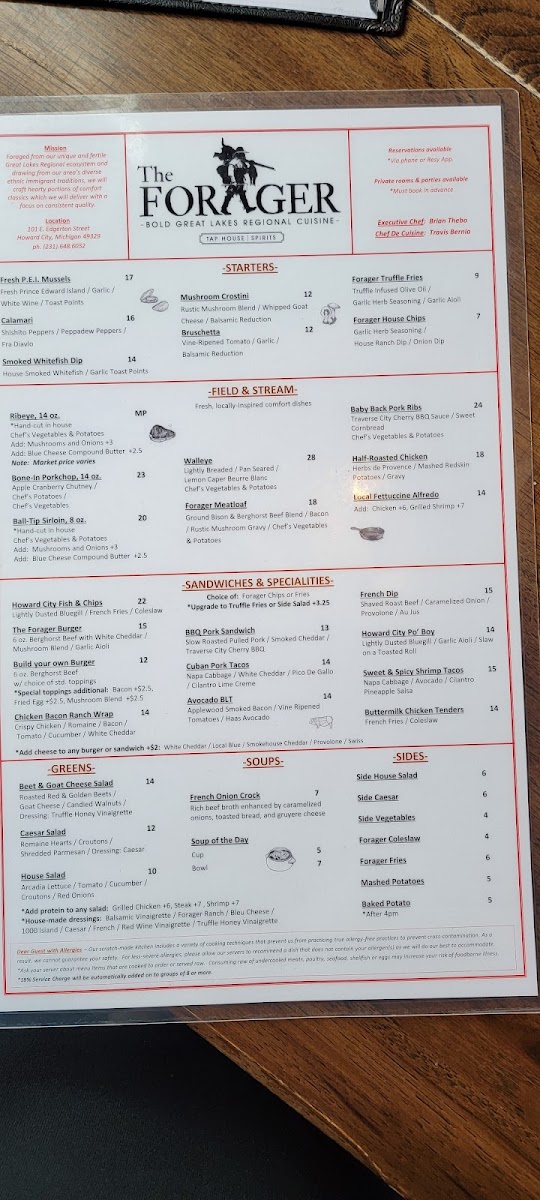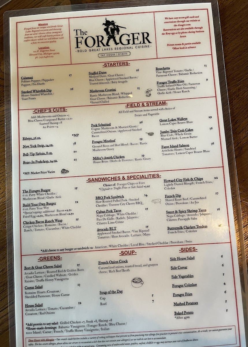 Introducing the menu at The Forager, located in Howard City, MI, is a delightful experience for any food enthusiast. This restaurant offers a vibrant selection that captivates the palate with both classic and inventive dishes. You can indulge in their Pork Schnitzel and Great Lakes Walleye, or savor the richness of their Forager Meatloaf and Faroe Island Salmon. Sandwich lovers will appreciate the Howard City Fish & Chips and Build Your Own Burger options, while the Taco variations thrill with a burst of flavor. The attention to detail in preparation shines through in customer favorites like the French Dip and Sweet & Spicy Shrimp Tacos, which consistently receive rave reviews for their freshness and quality. Diners frequently commend the friendly service and immaculate ambiance, which create an inviting environment for memorable occasions. Overall, The Forager stands as a culinary gem, perfect for celebrating special moments or simply enjoying a hearty meal.